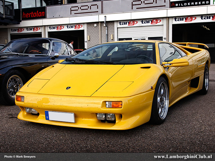 Buiten deze twee oldtimers waren er nog twee Diablo aanwezig, een zilverkleurige zeer vroege versie met het grote dashboard en een bijzonder geel exemplaar. Deze laatste was een post-93 model met het kleine dashboard zoals de VT versie, maar dit was ook een 2wd editie, maar als we alles van korterbij bekijken dan merken we direct dat de velgen op deze wagen eigenlijk van de Roadster versie komen ... en de moterkap origineel op de gelimiteerde SE30 stond.