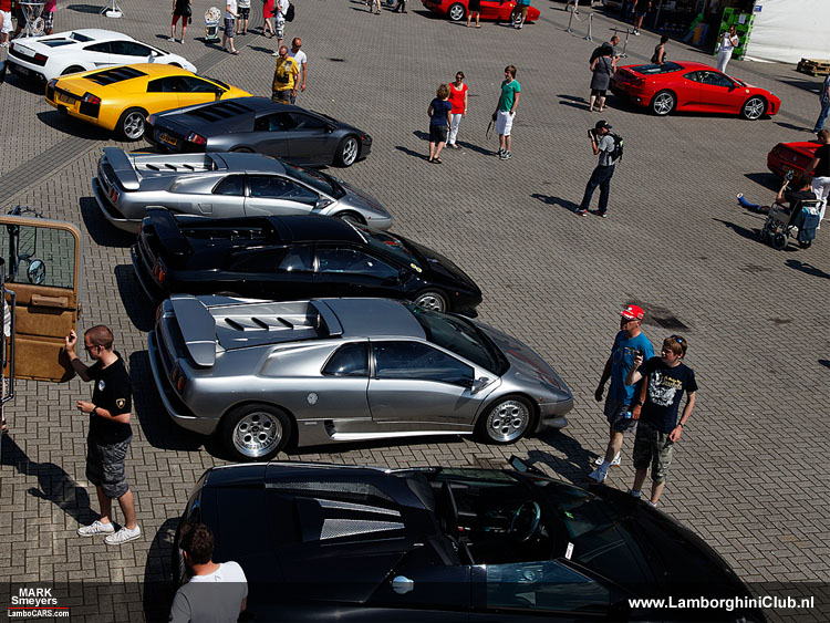 Later op de dag kwamen er trouwens nog enkele Murcielago aan, beide in 6.2 uitvoering, maar daarom niet minder indrukwekkend natuurlijk, er stond al een bijzonder indrukwekkende, zwarte Gallardo op de stand 's morgens, met de donkere wielen was hij vrij speciaal, er was trouwens ook een zeldzame Gallardo Spyder aanwezig, afgewerkt in Rosso Leto met een tweekleurige bekleding ... zo rijden er echt niet veel rond wereldwijd hoor ... en om het plaatje helemaal kompleet te maken was er ook nog een witte Gallardo LP560-4 bijgekomen die samen met een wel heel speciale Diablo VT Roadster aankwam. Deze laatste was een 1999 model met de vaste koplampen, maar de eigenaar had nog heel wat speciale LED verlichting gestoken ... beetje apart, maar toch smaakvol, en het maakte deze ondertussen klassieke Roadster heel actueel, deze wagen is ondertussen 12 jaar oud, en zag er nog altijd perfect uit.